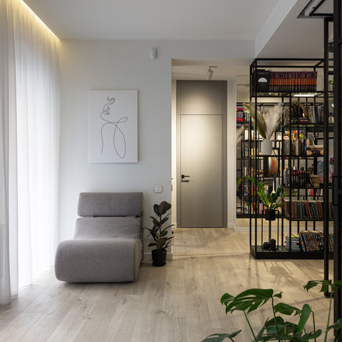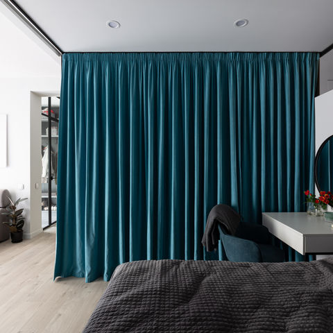 Ми створили окрему спальню, ергономічну кухню, затишну вітальню, велику гардеробну. На початку обговорення смаків та вподобань ми запитали наших клієнтів, який колір їм подобається) І виявилося, що це колір їхнього кошеняти, у якого благородна димчасто-сіра шерсть. Ми взяли його за основу і додали кілька кольорових акцентів. Наприклад, штори в спальню, які візуально відокремлюють її від вітальні і створюють особливий затишок всередині кімнати.